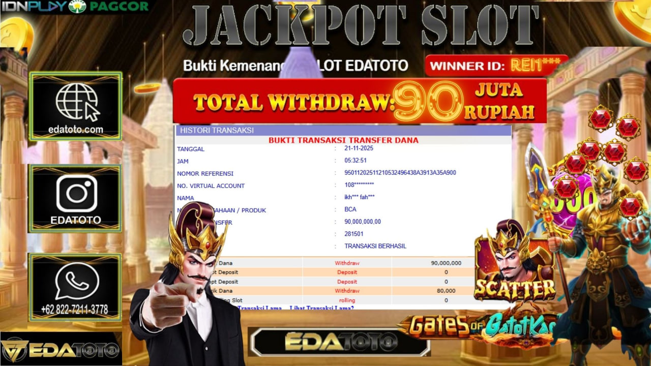 Selamat Kepada Pemilik user ID : REI1*** Hari/Tanggal :JUM’AT / 19, November 2025 Jackpot : Rp. 96,00,000 JT Withdraw :90,000,000 JT . . .
