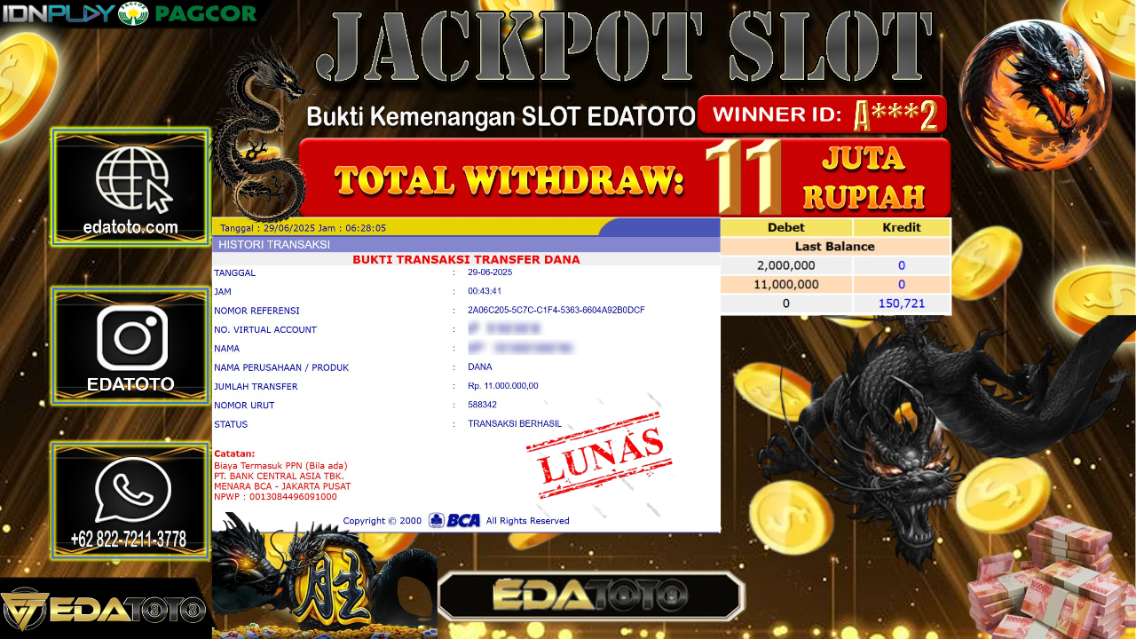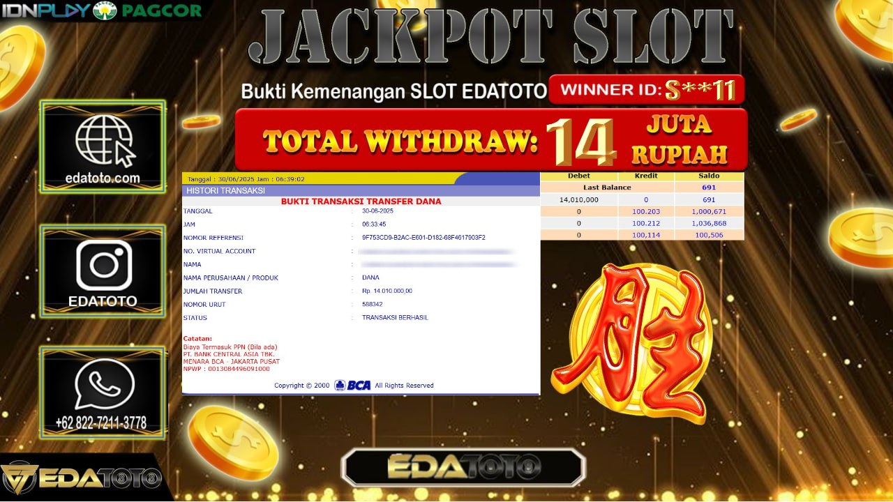 Selamat Kepada Pemilik user ID : S**11 Hari/Tanggal : Senin/ 30, Juni 2025 Jackpot : Rp. 14.000.000 JT Permainan : . . .