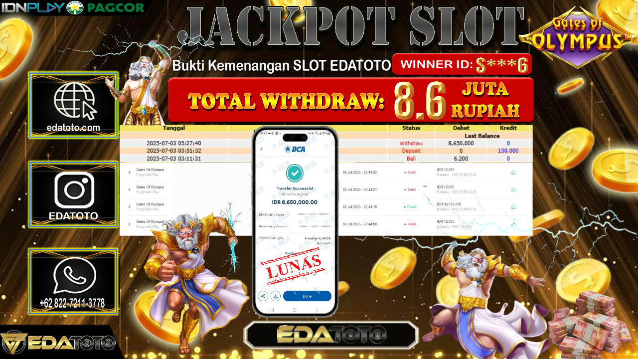 Selamat Kepada Pemilik user ID : S***6 Hari/Tanggal : Kamis/ 03, Juli 2025 Jackpot : Rp. 8.600.000 JT Permainan : . . .