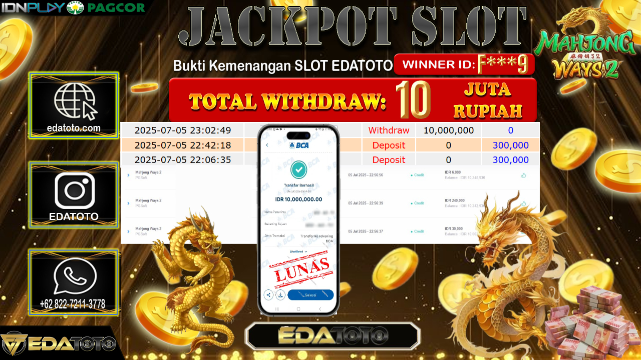 Selamat Kepada Pemilik user ID : F***9 Hari/Tanggal : Rabu/ 02, Juli 2025 Jackpot : Rp. 10.000.000 JT Permainan : . . .