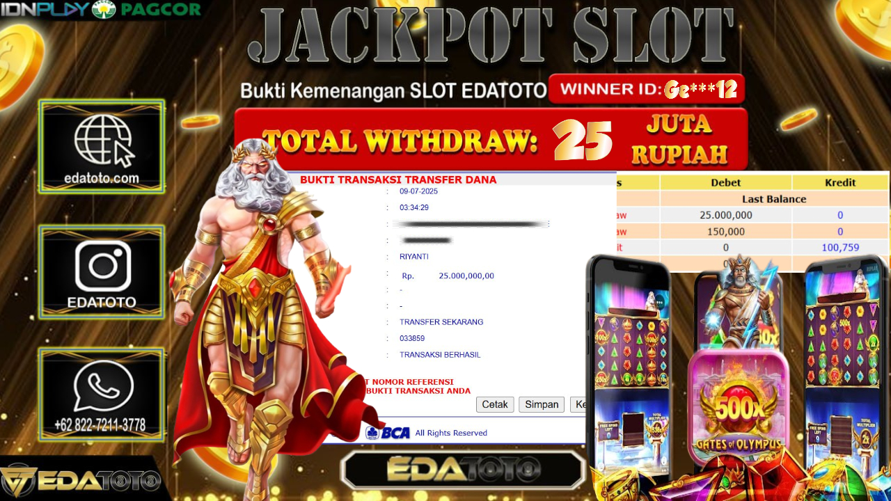 Selamat Kepada Pemilik user ID : Ge***12 Hari/Tanggal : Rabu/ 09, Juli 2025 Jackpot : Rp. 25.000.000 JT Permainan : GATES . . .