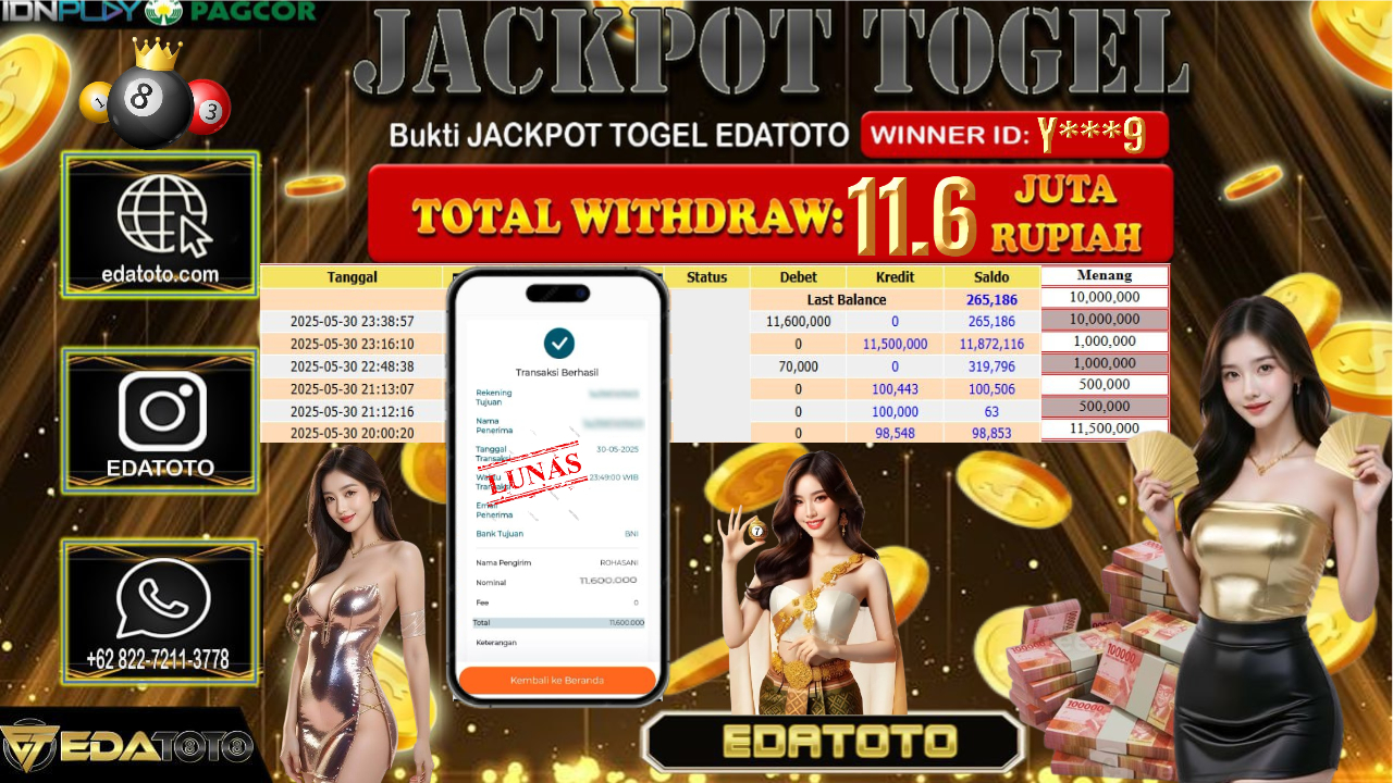 Selamat Kepada Pemilik user ID : Y***9 Hari/Tanggal : Sabtu/ 31, Mei 2025 Jackpot : Rp. 11.600.000 JT Permainan : Togel . . .