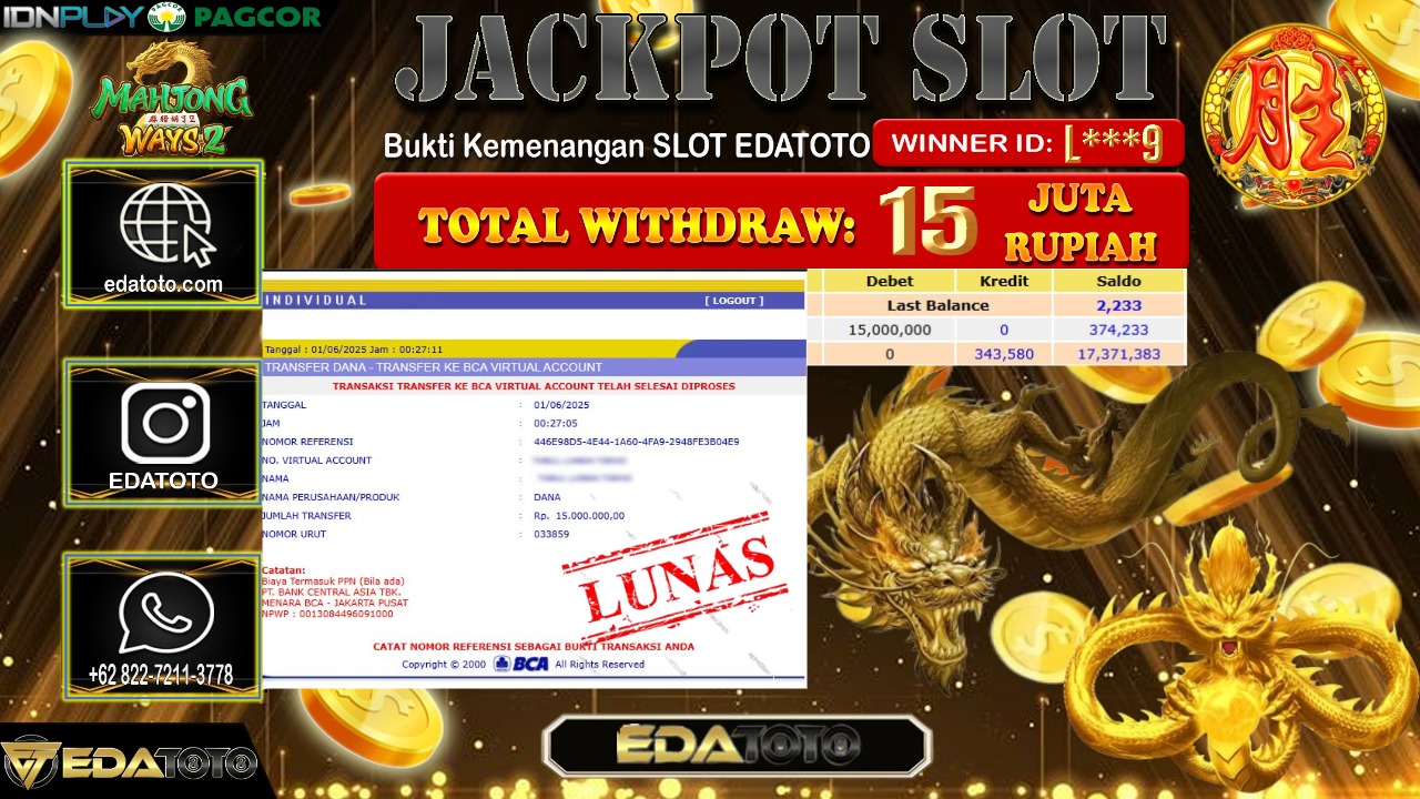 Selamat Kepada Pemilik user ID : L***9 Hari/Tanggal : Minggu/ 01, Juni 2025 Jackpot : Rp. 15.000.000 JT Permainan : Mahjong Ways . . .