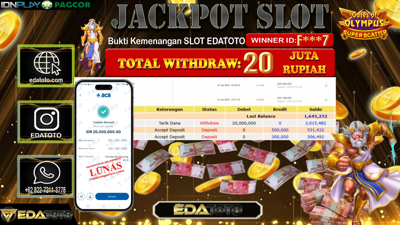 Selamat Kepada Pemilik user ID : F***7 Hari/Tanggal : Selasa/ 03, Juni 2025 Jackpot : Rp. 20.000.000 JT Permainan : Gates . . .