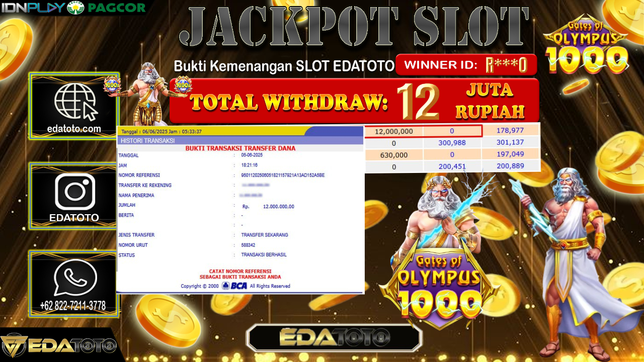 Selamat Kepada Pemilik user ID : R***0 Hari/Tanggal : Jum’at/ 06, Juni 2025 Jackpot : Rp. 12.000.000 JT Permainan : Gates Of . . .