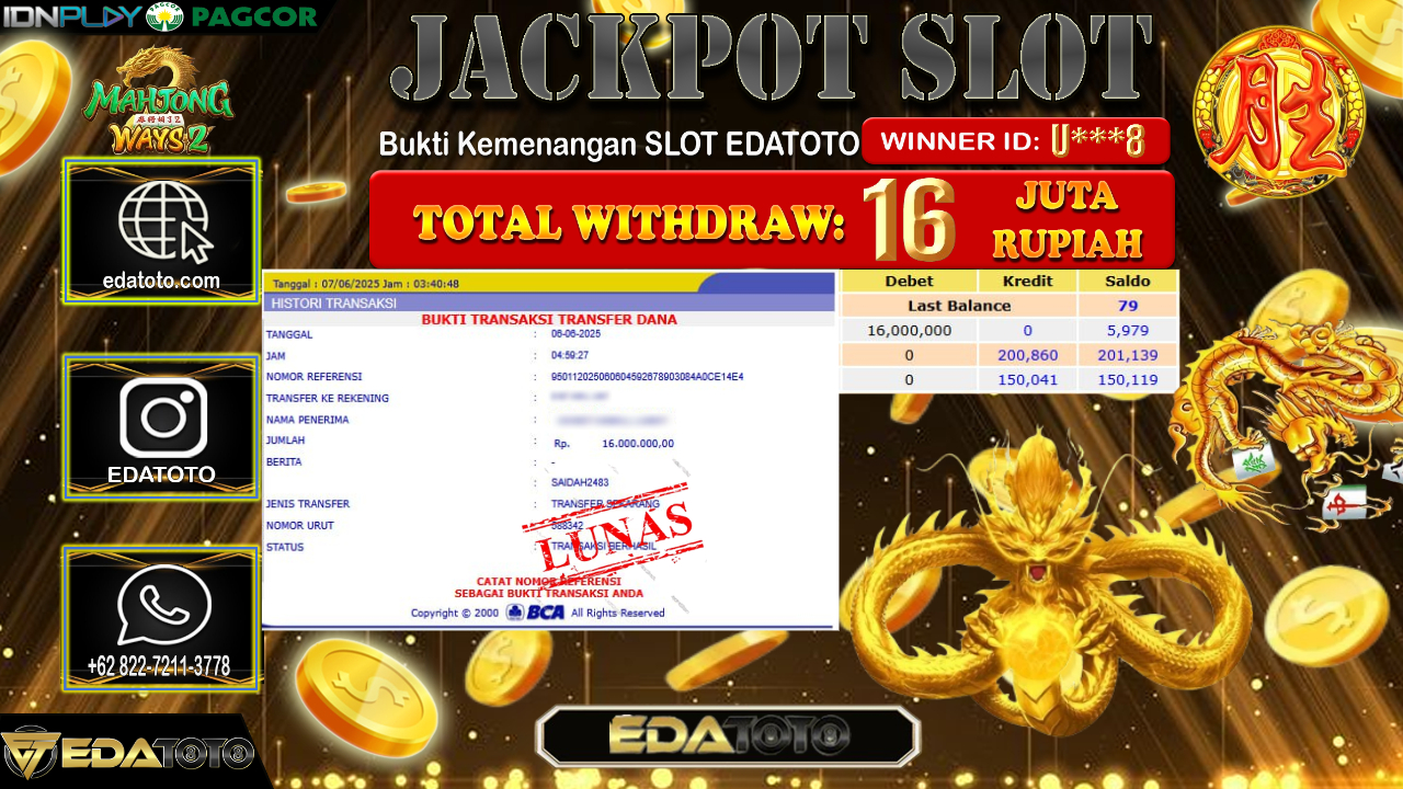 Selamat Kepada Pemilik user ID : U***8 Hari/Tanggal : Sabtu/ 07, Juni 2025 Jackpot : Rp. 16.000.000 JT Permainan : Mahjong Ways2 . . .