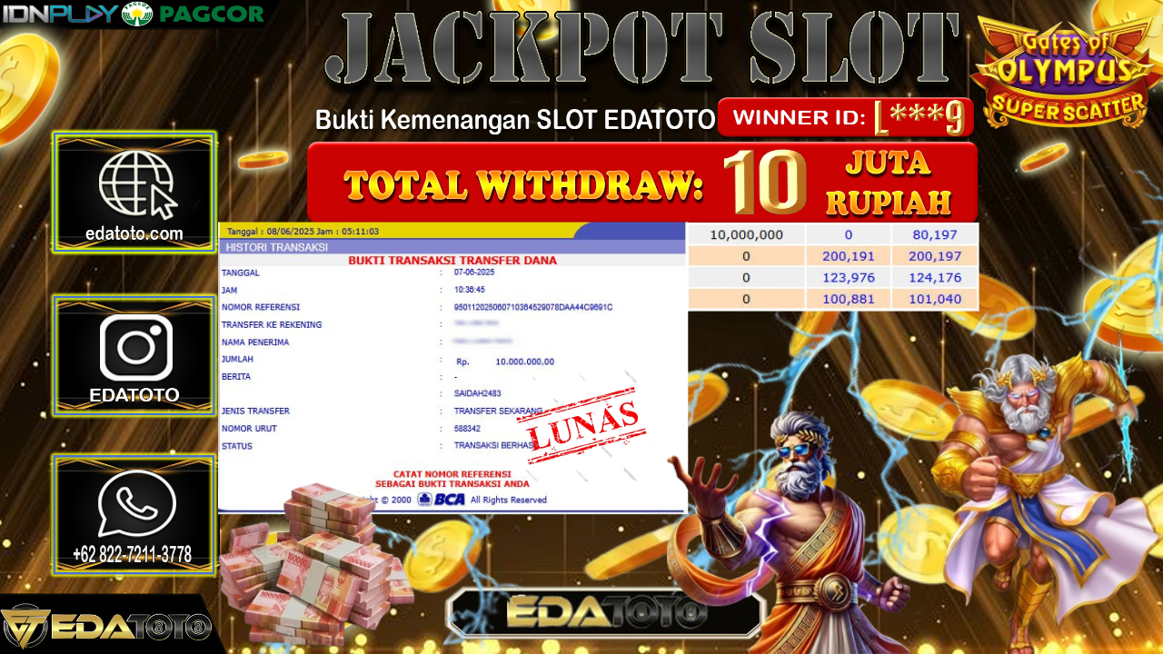 Selamat Kepada Pemilik user ID : L***9 Hari/Tanggal : Minggu/ 08, Juni 2025 Jackpot : Rp. 10.000.000 JT . . .