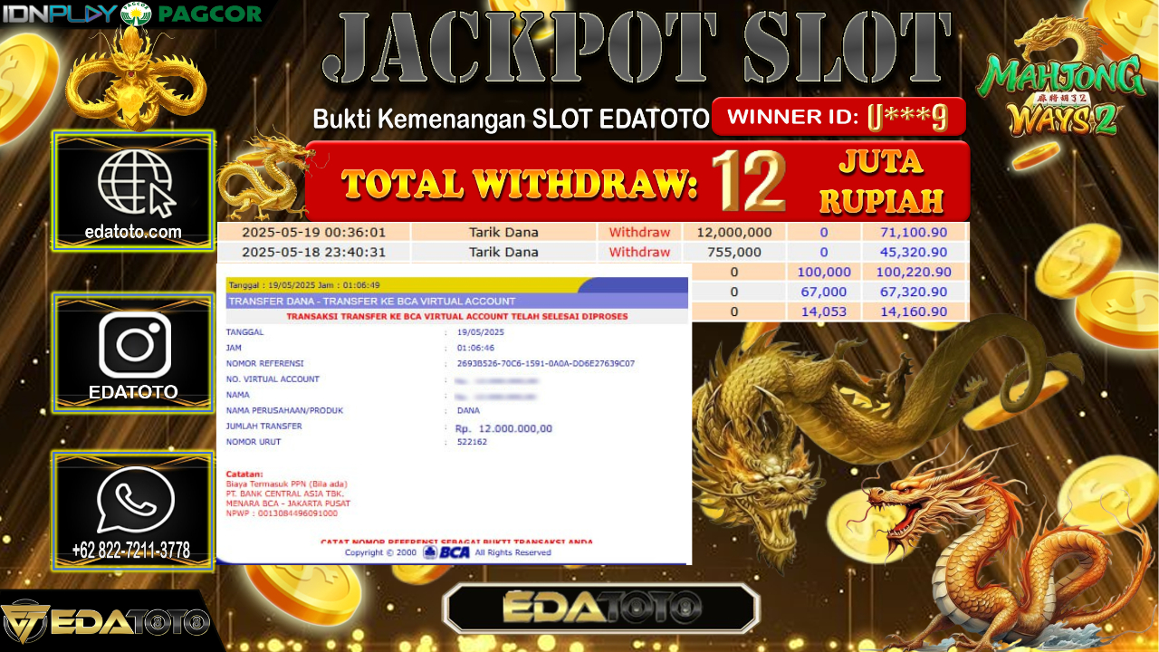 Selamat Kepada Pemilik user ID : U***9 Hari/Tanggal : Rabu/ 21, Mei 2025 Jackpot : Rp. 12.000.000 JT Permainan . . .