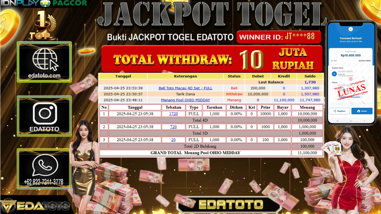 Selamat Kepada Pemilik user ID : R***G Hari/Tanggal : RABU/ 30 April 2025 Jackpot : Rp. 10.000.000 JT Permainan : TOGEL Selamat . . .