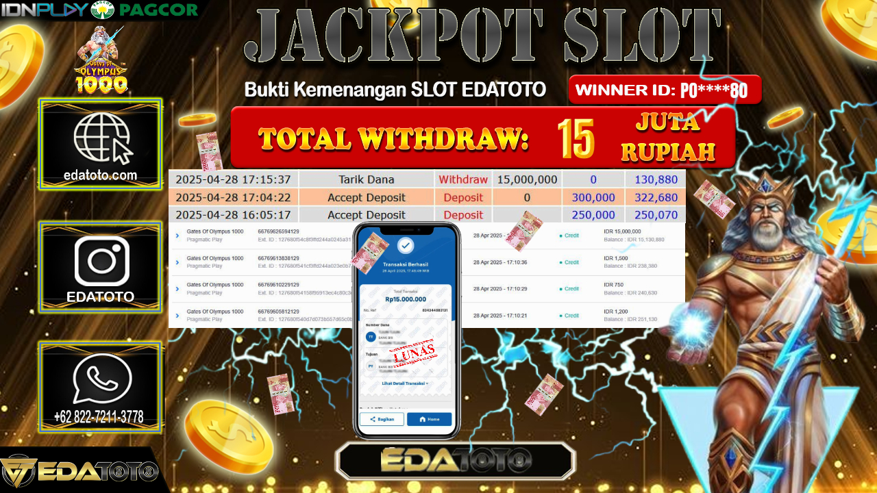 Selamat Kepada Pemilik user ID : PO****80 Hari/Tanggal : Selasa/ 29, April 2025 Jackpot : Rp. 15.000.000 JT Permainan : GATES OF . . .