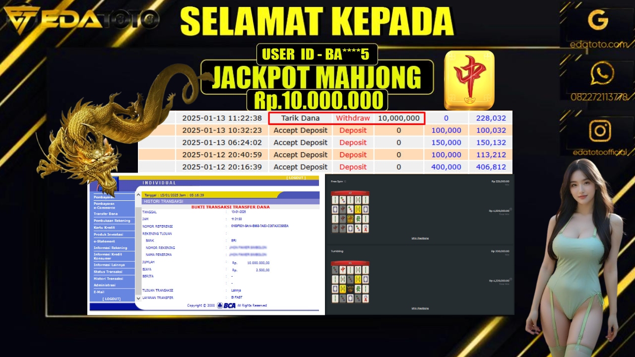 Selamat Kepada Pemilik user ID : BA****5 Hari/Tanggal : RABU / 15 , JANUARY 2025 Jackpot : Rp. 10.000.000 JT . . .