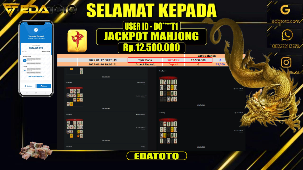 Selamat Kepada Pemilik user ID : ME****12 Hari/Tanggal : KAMIS / 16 , JANUARY 2025 Jackpot : Rp. . . .