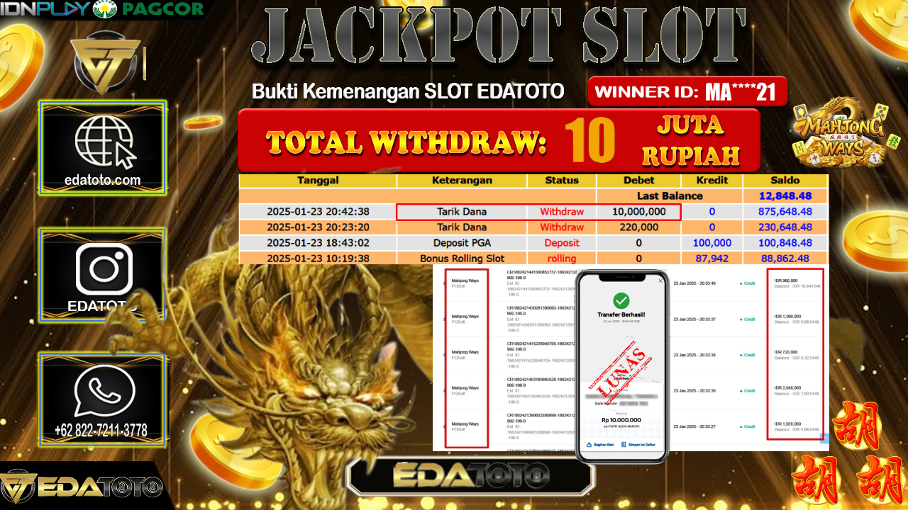 Selamat Kepada Pemilik user ID : MA****21 Hari/Tanggal : Jumat/ 24 , JANUARY 2025 Jackpot : Rp. 10.000.000 JT Permainan . . .