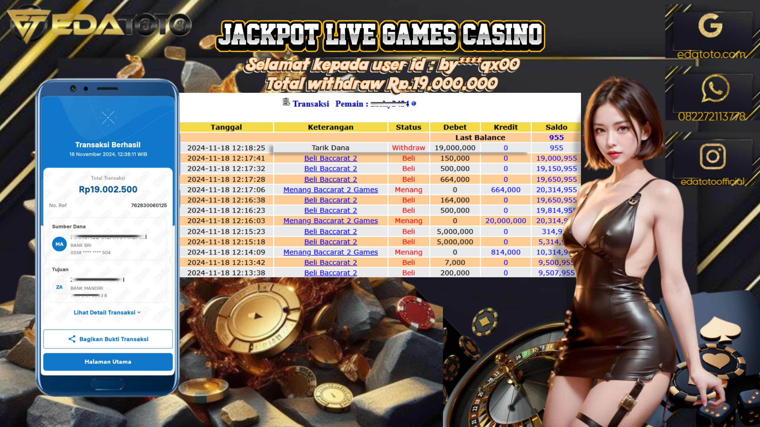 Selamat Kepada Pemilik user ID : by****qx00 Hari/Tanggal : Jumat/ 18 NOVEMBER 2024 Jackpot : Rp. 19.000.000 JT Permainan : . . .