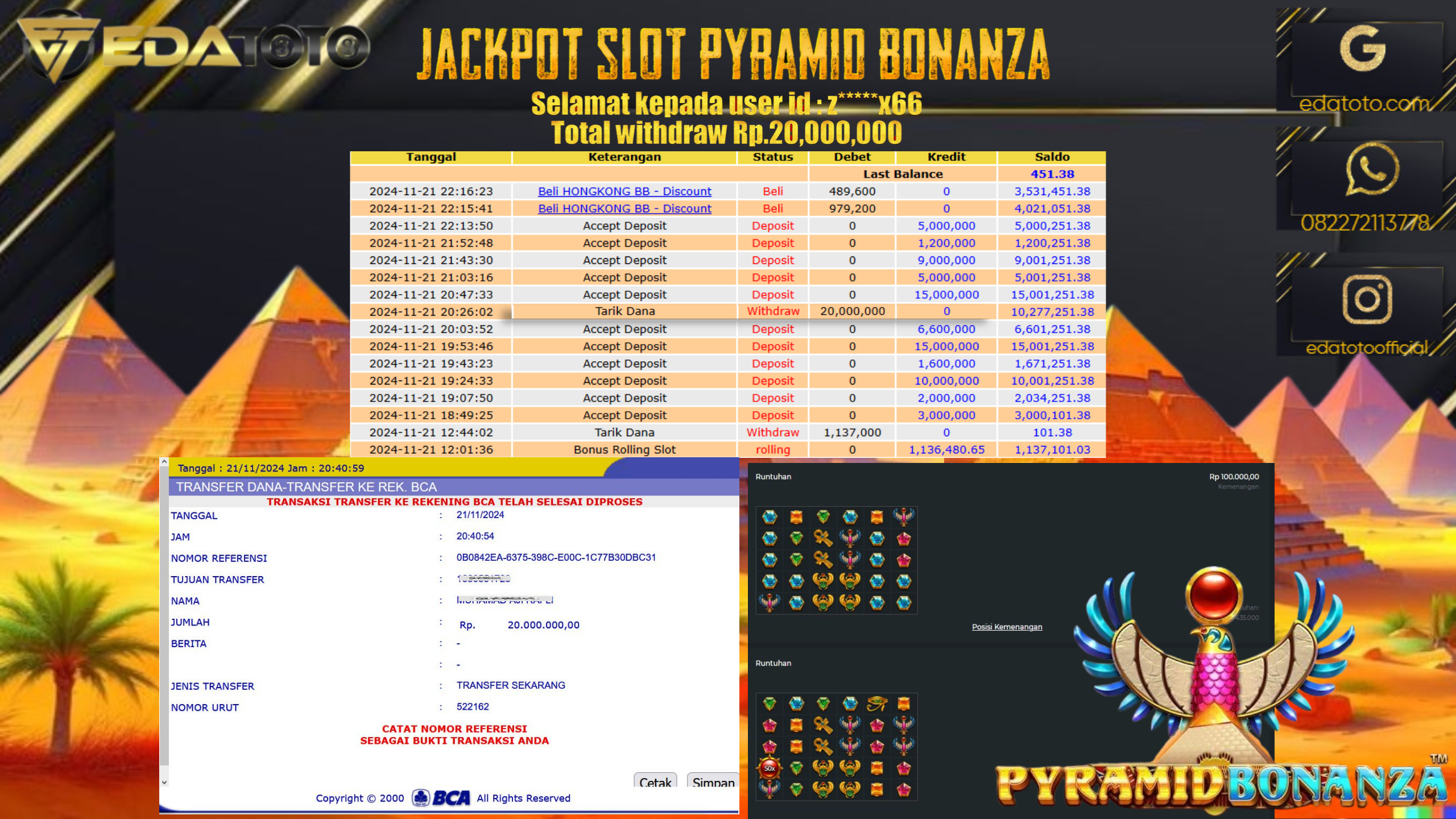 Selamat Kepada Pemilik user ID : z*****x66 Hari/Tanggal : Jumat/ 21 NOVEMBER 2024 Jackpot : Rp. 20.000.000 JT Permainan : . . .