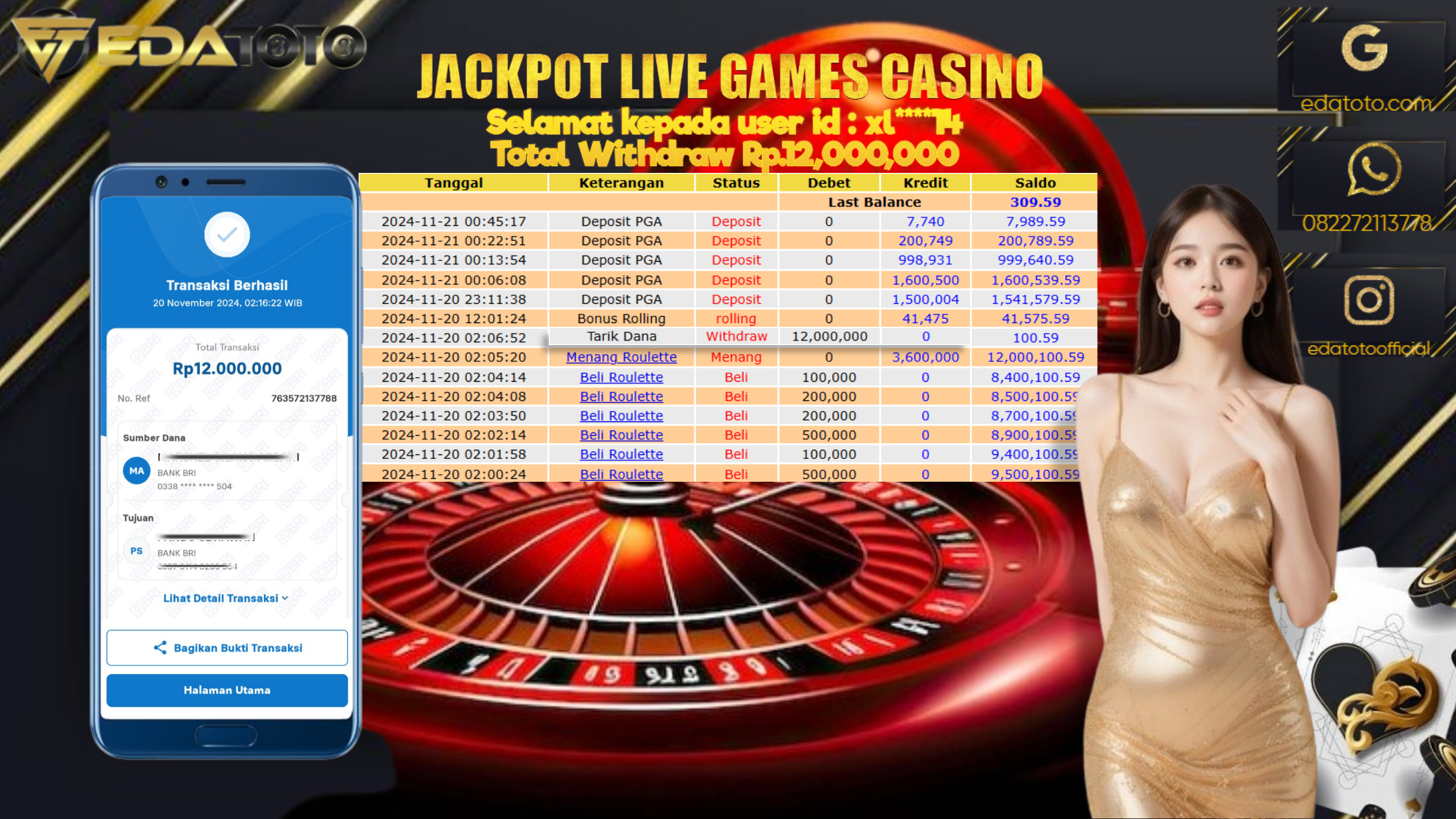 Selamat Kepada Pemilik user ID : xl****14 Hari/Tanggal : Jumat/ 20 NOVEMBER 2024 Jackpot : Rp. 12.000.000 JT Permainan : . . .