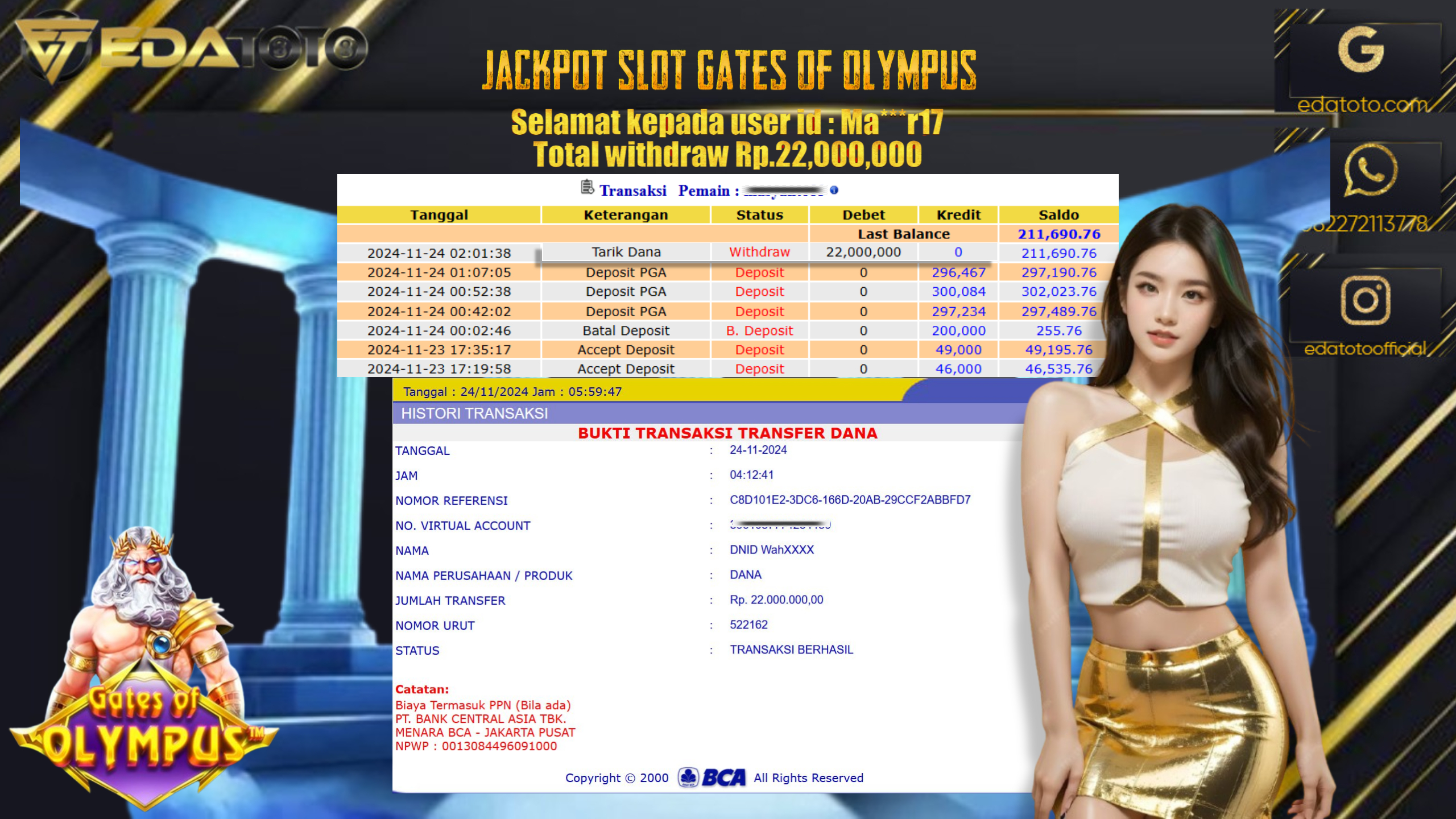 Selamat Kepada Pemilik user ID : Ma***r17 Hari/Tanggal : Jumat/ 24 NOVEMBER 2024 Jackpot : Rp. 22.000.000 JT Permainan : . . .