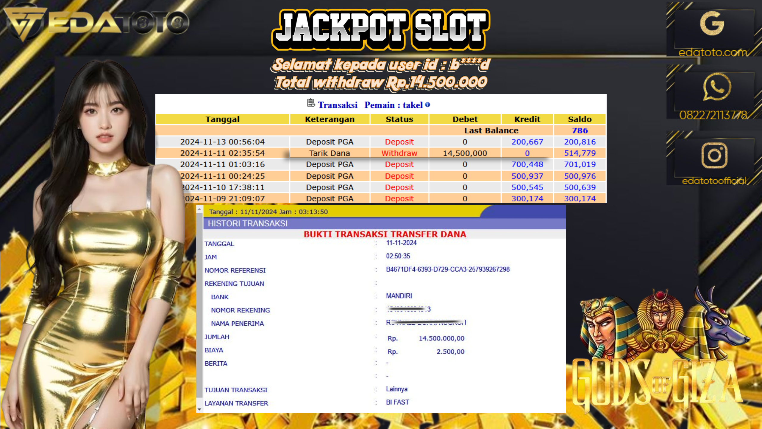 Selamat Kepada Pemilik user ID : b***d Hari/Tanggal : Jumat/ 11 NOVEMBER 2024 Jackpot : Rp. 14.500.000 JT Permainan : . . .