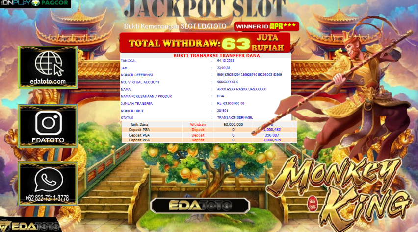 Selamat Kepada Pemilik user ID : APR**** Hari/Tanggal :KAMIS / 4, DESEMBER 2025 Jackpot : Rp. 72,505,000 JT Withdraw :63,000,000 . . .